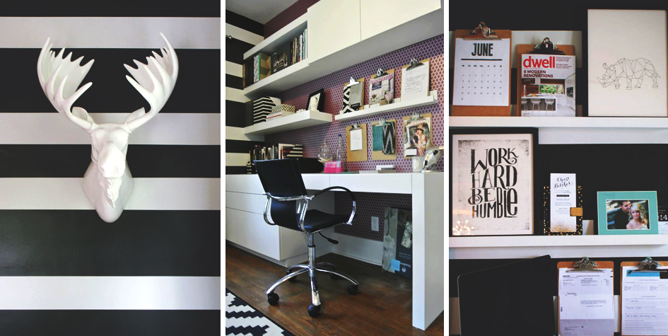 In her favorite place within the home, the home office, she coated the walls in bold black and white stripes and included a purple wallpaper accent wall. Otte describes the office as now feeling inspirational and energetic, which is vital for the entrepreneurial work she does.